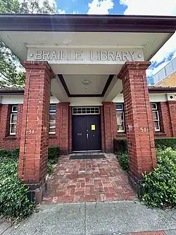 A purpose-built Library was constructed on Commercial Street, South Yarra, Melbourne, Victoria in 1918, to house the growing collection of the Victorian Association of Braille Writer's. The funds for the building were obtained from the Edward Wilson Trust, who donated funds to benefit injured and blinded returned soldiers.[13] The Library had coconut matting on the floor and commissioned two stained glass windows to commemorate the birth of Louis Braille's birth in 1929 for the benefit of their low vision patrons.[14][15]