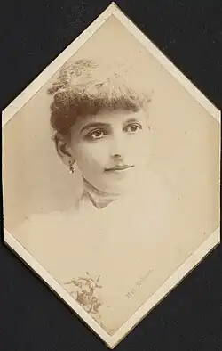 Robson ran away from home to marry her first husband, 18 year-old Charles Leveson Gore, in London.[9][10] They were married on 1 November 1875 at the parish church in Camden Town, London.[16][e] They traveled on the steamer SS Vaderland and arrived in New York on 17 May 1877. They purchased 380 acres of land in Fort Worth, Texas where they built a house and established a cattle ranch. According to Jan Jones, "the Gores survived two years in their prairie manor house before homesickness, rural isolation, and repeated bouts of fever convinced them to sell and try their fortunes in the more settled East."[17] They moved to New York City[10] with little money and Robson said that Gore died shortly thereafter.[10][f]