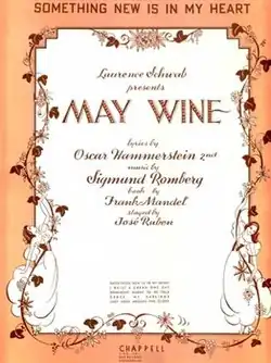 May Wine is a musical with a book by Frank Mandel, lyrics by Oscar Hammerstein II, and music by Sigmund Romberg. The show was adapted from the novel The Happy Alienist by Eric von Stroheim and Wallace Smith. The story concerns the rich and absent-minded psychology professor, Johann Volk, who falls in love with Marie (Baroness von Schlewitz). The malevolent Baron Kuno Adelhorst, who also loves Marie, tries to get the professor's money by having Marie marry him, but after they are married she comes to love the professor and does not want to blackmail him. However, the Professor thinks he has been deceived and tries to shoot Marie. He does not hurt her, and all ends well. The subplot involves an artist's model, Friedl, who wants a man's attention and gets it from the Baron.