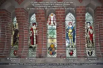 Many of the boarding students came from ethnic minorities, and while Catholicism was the underlying faith students were accepted without obligation from any race or religion. In later years additional lay staff were employed with non-Catholic and even non-religious beliefs. Pupils of all denominations were encouraged to maintain their religious commitment but the Catholic faith was the integrating principle, providing an ethos for work and play at the school.[16] Pupils all belonged to one of four Houses[17] named after saints (Edmund) Campion, (John) Fisher, (Thomas) More and (Oliver) Plunkett, memorialized both in stained glass windows in the chapel lobby and on house captain boards in the second-floor lobby, most which are preserved in the converted building. In the second half of the 20th century the House System was the most important element in a pupil's life at Mayfield, and was used to foster both camaraderie and competition in sporting, social and cultural activities. Everyone was expected to play a role and contribute to their House, and as a senior pupil it was the main mechanism through which to discover and develop a capacity for leadership in preparation for later life. "In addition to what is normally termed Catholic education we aim to give boys practice in the right use of liberty and to develop in them a sense of true responsibility," explained the headmaster in 1966.[13]