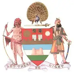 In the upper centre of the shield are Mayo Arms and Quarterings, a Lion Rampant and an open hand. On the right and left are the sun and the moon, typical of Suryavanshi and Chandravanshi, the two great families of Rajputs. Below are the Panch Rang, the five sacred colours of the Rajputs, Red, Gold, Blue, White and Green. In the centre is a Rajput fort – two towers connected by a curtain. The supports are on the right: a Bhil warrior with string bow and full quiver of arrows. On the left a Rajput, armed at all points, wearing a steel helmet with three plumes, a shield on his back, a dagger and katar in his belt, and a suit of chain covered with embroidered cloth and gauntlet on his hand.