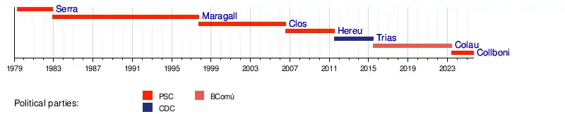 | 114 | Pasqual Maragall | | 13 January 1941 Barcelona | 2 December 1982 | 26 September 1997 (14 years, 298 days) | 1983 1987 1991 1995 | ||