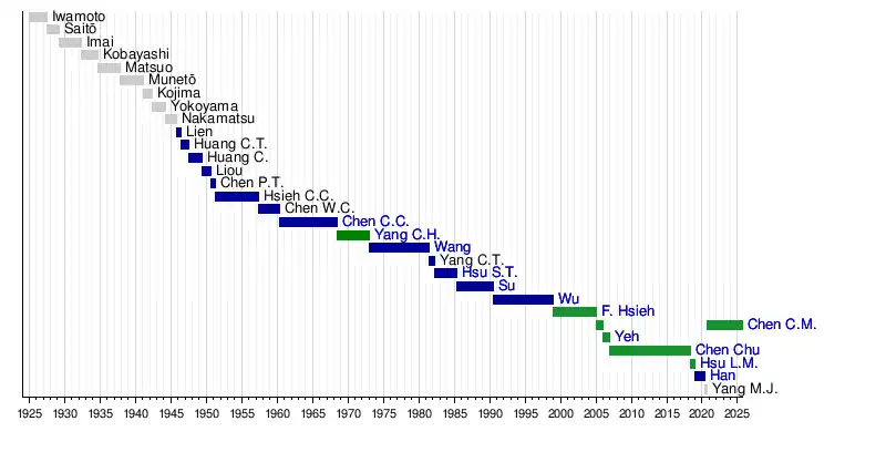 | 8 | | Chen Chu[16] 陳菊 (1950–) | 25 December 2006 | 25 December 2010 | 4 | Democratic Progressive Party |