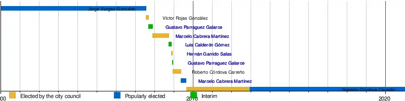 22. ^ Following Cabrera Martínez's resignation as mayor to be legally able to be a candidate for the office, he appointed Luis Calderón Gómez as the interim mayor, on 29 September 2008.[56] Since Cabrera was prohibited from using public offices in October of that year, Calderón held the mayoralty until 12 November 2008, when the city council elected Hernán Garrido Salas to complete Cabrera's term, which would last until 6 December.[57]