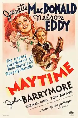 Maytime was adapted to film twice, in 1923 and again in 1937. The earlier version was thought to have been lost, but a copy was found in 2009 in the New Zealand Film Archive. Four of the seven reels have been restored.[5][6] The 1937 version, starring Jeanette MacDonald and Nelson Eddy, has a different plot from the musical's book and a different score except for one song.[7]