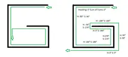 The hand is removed from the wall only when both "sum of turns made" and "current heading" are at zero. This allows the algorithm to avoid traps shaped like an upper case letter "G". Assuming the algorithm turns left at the first wall, one gets turned around a full 360 degrees by the walls. An algorithm that only keeps track of "current heading" leads into an infinite loop as it leaves the lower rightmost wall heading left and runs into the curved section on the left hand side again. The Pledge algorithm does not leave the rightmost wall due to the "sum of turns made" not being zero at that point (note 360 degrees is not equal to 0 degrees). It follows the wall all the way around, finally leaving it heading left outside and just underneath the letter shape.