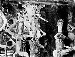 Mbari is a visual art form practiced by the Igbo people in southeast Nigeria consisting of a sacred two- story house constructed as a propitiatory rite.[1] Mbari houses of the Owerri-Igbo, which are large opened-sided square planned shelters contain many life-sized, painted figures (sculpted in mud to appease the Alusi (deity) and Ala, the earth goddess, with other deities of thunder and water).[2] Mbari houses are made as a gift to Ala, as a way to acknowledge Ala's charitable and overarching presence. Some Mbari houses are dedicated strictly and solely to Ala. Sometimes, however, other gods are represented along with Ala in the structure.[3] Other sculptures which could be included are of officials, craftsmen, animals, legendary creatures and ancestors.[2] Mbari houses take years to build and building them is regarded as sacred. Along with being representations of abundances and harmony, they are most usually created during times of peace and stability.[4] A ceremony is performed within the structure for a gathering of town leaders. After the ritual is complete, going in or even looking at the Mbari house is considered taboo. Mbari are public shrine galleries where complex characters of Igbo mythology, folklore, and society are fleshed out in termite earth.