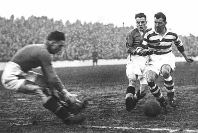 No honours were achieved either in 1929–30, although McGrory continued to score regularly, netting 36 goals in 29 League and Scottish Cup games.[30] Injuries were by now starting to take their toll on McGrory, who was always a regular target for some brutal 'defending'. He missed the first six games of season 1930–31 due to such an injury.[31] While the League campaign was to ultimately prove disappointing, the team had shown promise and improved on the previous seasons finish of fourth place, running eventual winners Rangers close and finishing in second place only two points behind them.[31][32] Celtic scored 101 goals in the process,[32] with McGrory helping himself to a very credible 36 of them in only 29 games.[31] The 1930–31 Scottish Cup was to prove more fruitful all round, where he ended up with a winners medal and eight goals from six games. In the Cup Final on 11 April 1931, he scored the opening goal in a 2–2 draw against Motherwell in front of crowd of 104,863 at Hampden Park, Glasgow. The replay took place on 15 April 1931, which Celtic won 4–2 thanks to two goals each from McGrory and Bertie Thomson.[30][33]