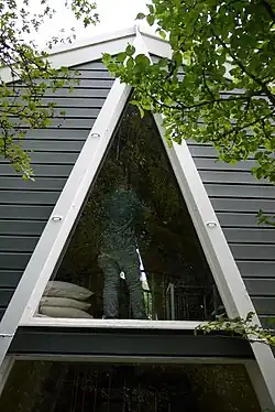 With the knowledge that he had to cantilever his house in some way and that he would be limited in his materials and constructional methods, McIntyre designed a rigidly geometric house that featured shallow triangular living quarters perched atop a far more vertically elongated triangle that formed the access stairwell. The house was thus cantilevered either side of the "access" triangle.
