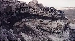 The predominant geologic feature, and the one that makes the McKittrick field distinctive, is the presence of a huge block of Monterey shale – more than 6 mi (9.7 km) long, approximately 1 mi (1.6 km) wide, and up to 2,000 ft (610 m) thick – which slipped off of the slopes of the adjacent Temblor Range during the Pleistocene and moved eastward onto the plain, almost entirely covering the field, and forming an impermeable cap over the oil-bearing rock. This mass of stone, consisting of over 3 cu mi (13 km3) of rock, moved 2 to 3 miles (3.2 to 4.8 km) from its source region, and down about 2,000 feet (610 m) in elevation. While it probably did not move into its present position all at once, the incident must have been dramatic.[4][5]