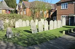 This doctrinal shift happened at Godalming, where General Baptist meetings have a long history. Small groups identifying as Baptist but with no organised structure met in various places in the Godalming area from the 17th century, helped by regular visits from prominent preacher Matthew Caffyn of Horsham in Sussex. By the second half of the 18th century, meetings regularly took place at the house of William Evershed, who lived between Godalming and Eashing. Evershed merely leased this cottage:[10] he owned land and a house in Billingshurst near Horsham, and in 1754 he founded a General Baptist chapel there which soon became Unitarian. (It continues in use as Billingshurst Unitarian Chapel,[11] and descendants of the Evershed family maintained a 260 year connection with it. The last of that line, Susie Evershed, died in August 2022, aged 90, and her memorial stone sits in the chapel grounds surrounded by over 120 Evershed family members who lived and worshipped in the village).[12]