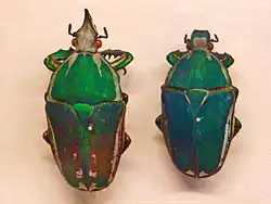 | Mecynorrhina torquata, male and female. Mounted specimen at the National Museum (Prague) | |
