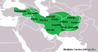Media (Old Persian: 𐎶𐎠𐎭 Māda; Greek: Μηδία Mēdía; Akkadian: Mādāya)[1] was a political entity centered in Ecbatana that existed from the 7th century BCE until the mid-6th century BCE and is believed to have dominated a significant portion of the Iranian plateau, preceding the powerful Achaemenid Empire. The frequent interference of the Assyrians in the Zagros region led to the process of unifying the Median tribes. By 612 BCE, the Medes became strong enough to overthrow the declining Assyrian empire in alliance with the Babylonians. However, contemporary scholarship tends to be skeptical about the existence of a united Median kingdom or state, at least for most of the 7th century BCE.[5]
