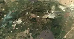 Medicine Lake Volcano is a large shield volcano in northeastern California about 30 mi (50 km) northeast of Mount Shasta. The volcano is located in a zone of east–west crustal extension east of the main axis of the Cascade Volcanic Arc and the Cascade Range. The 0.6 mi (1 km) thick shield is 30 mi (50 km) from east to west and 50 mi (80 km) from north to south, and covers more than 800 sq mi (2,200 km2).[6] The underlying rock has downwarped by 0.3 mi (0.5 km) under the center of the volcano. The volcano is primarily composed of basalt and basaltic andesite lava flows, and has a 4 by 7 mi (7 by 12 km) caldera at the center.