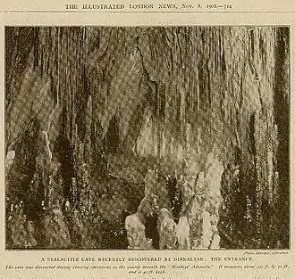 A cave with this name is recorded by Colonel E. R. Kenyon as having been occupied in 1779–1783 during the Great Siege of Gibraltar. However, it is not known which cave that was. The present Mediterranean Cave was discovered in August 1902[3] as the result of quarrying by the Admiralty. The cave was 40 feet high, 70 feet wide and 350 feet long. Because of its size, it was referred to as a "mammoth cave", but there was already a cave of that name on Gibraltar.[5] A photo of the recently discovered cave's stalactites was included in The Illustrated London News that November,[6] and the story was picked up in Australia.[7] The cave was still being called "Mammoth" in those reports, but it was then called "Mediterranean Cave".[5]