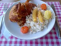 Portugal lies on the Atlantic, not the Mediterranean, but it is in the Mediterranean basin, characterised by olive groves and a Mediterranean climate, except on the wetter Atlantic coast.[85][86] Its cuisine too is partly Mediterranean, with the usual trio of bread, wine, and olive oil, but also partly Atlantic, with a tradition of fishing and many seafood dishes such as seafood rice (arroz de Marisco), clams, squid (lulas grelhadas), and bacalhau, imported salted cod.[87] There are, equally, many meat dishes, using chicken, pork, and rabbit. Other major ingredients are onions, garlic, sweet peppers (pimentão), and chouriço sausage. Piri-piri, a sauce made with chili peppers, garlic and oil, is popular.[88]