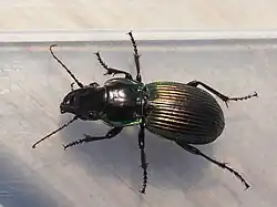 Megadromus antarcticus, also known as the “Alexander beetle”,[1] is a member of the Carabidae (ground beetle) family and only found in the Canterbury region of New Zealand.[2][3] Megadromus antarcticus are easily recognized by their iridescent green colouration.[4]