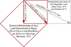 Some commentators upon Thom's megalithic yard (John Ivimy and then Euan Mackie[25]) have noted how such a measure could relate to geometrical ideas found historically in two Egyptian metrological units; the remen of about 1.2 feet and royal cubit of about 1.72 feet. The remen and royal cubit were used to define land areas in Egypt: "On documentary and other evidence Griffith came to the conclusion that the square on the royal cubit was intended to be twice that on the remen; and Petri identified the remen as a length of 20 digits".[26]