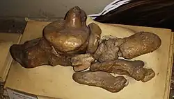 The bones of the forelimbs of M. americanum are relatively slender. The three fingers in the middle of the hand bore claws, while the cuneiform hand bones did not touch the ulna.[29] The olecranon process of the ulna was relatively short.[37] Like other xenarthrans, but unlike most other mammals, Megatherium possesses clavicles (collarbones), which serves to support the forelimb. Like other sloths, the clavicle is merged with the acromion of the scapula.[38] The femur was massive and roughly rectangular in shape.[29] As in most megatheriines, the tibia and fibula of Megatherium species are fused together at their proximal (closest to hip) end, while in M. americanum and M. tarijense, they are also fused together at their distal (closest to foot) ends.[39] The foot was heavily modified from those of other mammals and earlier ground sloths, with a reduction in the number of digits on the inner part of the foot (digits I and II being lost), the increase in the size and robustness (thickness) of the metapodial elements of the outer digits, with the loss or reduction of the phalangeal bones. The calcaneum is wide and elongate posteriorly. The foot is suggested to have been inwardly rotated, historically the foot was suggested to be near vertical, though a recent study suggests that the angle was much shallower. The weight was primarily borne on the outer digits and the calcaneum.[40] M. urbinai differs from M. americanum and other Megatherium species in the shape and position of the feet and hand bones, including the metacarpals, metatarsals, ectocuneiform, hamate/unciform, navicular and astragalus/talus.[21]