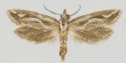 The holotype female's costal margin is 10 mm long, with a wingspan of 21 mm. Paratypes have slightly longer forewings at 11 mm and a wingspan of 22 mm. The antennae are a bit longer than half the forewing length, bipectinate, and white in color with black at the base. The head and tegulae are yellowish-white. The labial palps are yellowish-brown with white at the base.[1]