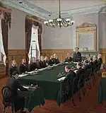 | 50 | Conference on Drafting a Constitution 枢密院憲法会議 Sūmitsuin kenpō kaigi  |  18 June 1888 | Goseda Hōryū (五姓田芳柳) (1864–1943)  |  October 1926 | Itō Hirobumi explains the draft of the Meiji Constitution to the Emperor and the Privy Council | ![]()  |  Prince Itō Hirokuni (伊藤博邦) |