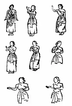 Panthoibi Jagoi (Meitei: ꯄꯥꯟꯊꯣꯢꯕꯤ ꯖꯒꯣꯢ) (literally, 'Panthoibi's dance' or 'Dance dedicated to the Divine Mother'[18]) is a duet dance form, portraying the romantic love affairs between Nongpok Ningthou and Panthoibi.[19][20] There are 14 hand gestures with bodily movements.[21] It is performed in the religious festival of Lai Haraoba, depicting the weaving process.[22] In the dance form, Marjing has been conflated with Nongpok Ningthou.[23] Nowadays, the dance form is replaced by the Khamba Thoibi Jagoi.[19]