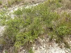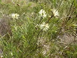 The flowers are pale yellow or white and are arranged in heads on the ends of branches which continue to grow after flowering, sometimes also in the upper leaf axils. The heads are up to 17 mm (0.7 in) in diameter and contain between 3 and 8 groups of flowers in threes. The stamens are arranged in bundles of five around the flower, with 4 to 7 stamens in each bundle. The flowering season is mainly in November and is followed by fruits which are woody capsules, 1.5–2 mm (0.06–0.08 in) long. The capsules are in clusters forming an almost spherical football shape.[2][3]