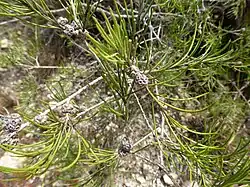 Melaleuca borealis is a shrub which grows to a height of 8 m (30 ft) with papery bark and stems, and leaves that are glabrous except when young. Its leaves are arranged alternately, linear in shape and almost circular in cross-section, 18–52 mm (0.7–2 in) long, 0.5–0.8 mm (0.02–0.03 in) wide with the end tapering to a point.[2]