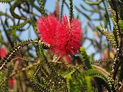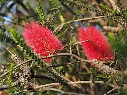 The flowers are brilliant red, arranged in bottlebrush-like spikes, 40–80 mm (2–3 in) long and about 50 mm (2 in) diameter on side branches. The petals are 3–4.5 mm (0.1–0.2 in) long and fall off soon after the flower opens. The stamens, which give the flowers their colour, are arranged in five bundles, each containing 11 to 15 stamens. Flowers appear in spring and summer and are following by fruit which are hairy, woody capsules 3.5–5 mm (0.1–0.2 in), tightly clustered in a cylindrical group.[2][3]