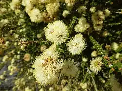 The flowers are white to a shade of yellow and fade to pink. They are arranged in heads on the ends of branches which continue to grow after flowering. The heads are up to 22 mm (0.9 in) in diameter and composed of up to 14 groups of flowers in threes. The petals are 2–2.7 mm (0.08–0.1 in) long and fall off as the flower opens. There are five bundles of stamens around the flower, each with 10 to 12 stamens. Flowering occurs between August and November and is followed by fruit which are woody, urn-shaped capsules usually 4–5 mm (0.16–0.20 in) long, in small clusters around the stem.[2][3]