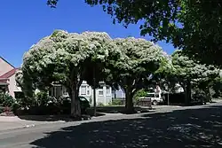 Melaleuca linariifolia is cultivated as an ornamental tree for parks and gardens and is also used as a screen or windbreak in Australia[8][9] and overseas.[10] It is popular as a nature strip tree in Melbourne in Victoria.[3] It tolerates both dry and boggy conditions and is frost hardy.[3] It should be planted with caution as it can damage wastewater pipes,[11] and is easily ignitable, so should not be planted in fire-prone areas. It has also become a garden escape in Western Australia,[12] it is however suitable for planting under powerlines[13] and is a food or habitat sources for native animals, including many insects.[13]
