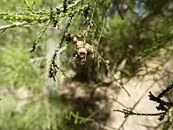 The flowers are white and arranged in small heads on the ends of branches that continue to grow after flowering or in the upper leaf axils. The heads are up to 12 mm (0.5 in) in diameter and composed of up to 8 individual flowers. The petals are 1.2–1.6 mm (0.05–0.06 in) long and fall off as the flower ages. There are five bundles of stamens around the flower, each with 6 to 14 stamens. Flowering occurs from October to February and is followed by fruit that are woody capsules 2–3.2 mm (0.08–0.1 in) long in small, loose clusters.[2][3]