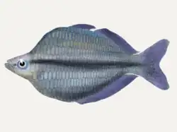 Both genders of this species boast a distinct steel-blue appearance. The scales of this fish are outlined with a darker shade, further emphasising the colours of this loveable fish. The pectoral fins are nearly transparent, whilst the tail, dorsal fin, and pelvic fins are a powder-blue with a purple-ish tint. The lateral scales are adorned with a thick, very dark band of navy blue. Females tend to have a slightly greyed out pattern.[3] Males, upon maturity, attain a disc-like, almost circular appearance.