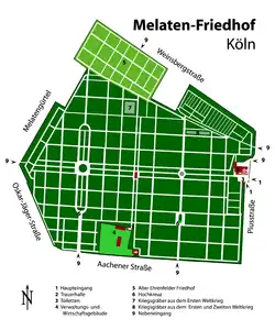 Melaten is in the north of the municipal district of Lindenthal.[2] It is surrounded by streets, in the south Aachener Straße (Köln), in the east Piusstraße, in the west Oskar-Jäger-Straße and the Melatengürtel, and in the north Weinsbergstraße. The 435,000-square-metre cemetery had 55,540 graves in 2008, and is the largest cemetery in the city.