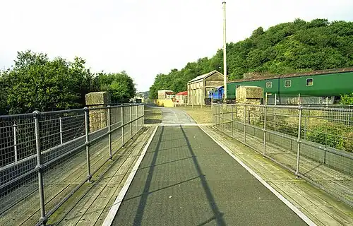 A new station at Meldon Quarry was opened during 2000 by Dartmoor Railway to act as the terminus of a passenger service from Okehampton. It has a single platform adjacent to the former up line but situated slightly nearer to Okehampton than the former Staff Halt. It is an entirely new construction unrelated to the previous Halt. The station was further improved in 2002 with the installation of concrete platform walling and a wooden platform shelter in BR Southern Region style and colour scheme. In 2015 the station was renamed Meldon Viaduct.[5] It was the western terminus of Dartmoor Railway heritage passenger services to Okehampton and Sampford Courtenay prior to the reintroduction of regular National railway services between Exeter and Okehampton. The station has no motor vehicle access but does have excellent pedestrian and cycle access via The Granite Way Cycleway, part of Devon Coast to Coast Cycle Route,[6] and has links to Dartmoor via the local footpath network. From 2010 to 2013 there was a buffet situated near the station in a former SR electric multiple unit buffet car.[7] The car overlooked Meldon Viaduct and the surrounding valleys.