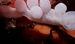 The dinosaur nudibranch is a white nudibranch distinguished by its large extendable hood. Puffy paired cerata extend down the notum and there is a projection of unknown function behind the rhinophore sheath.