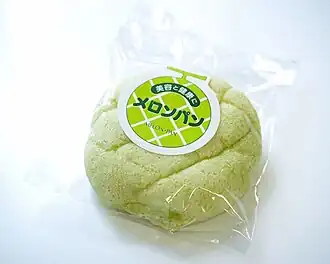 Melonpan (メロンパン, meronpan), also called melon bun or melon bread, is a Japanese sweetbun covered in a layer of crispy cookie dough. The texture resembles that of a melon, such as a cantaloupe. It is not traditionally melon-flavored.[1]