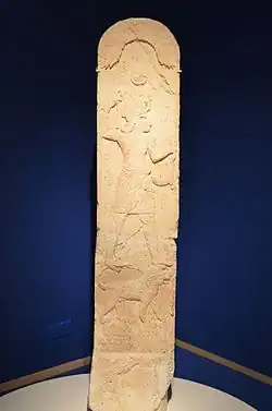 The first occurrence of the name is in the 9th-century BCE the "Ben-Hadad" inscription found in 1939 north of Aleppo in today's northern Syria; it had been erected by the son of the king of Aram "for his lord Melqart, which he vowed to him and he heard his voice".[12]