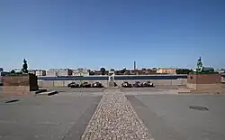 The architectural design of the monument was executed by Vyacheslav Bukhaev and Anatoly Vasilyev. The memorial is situated in front of the descent to the water on the Voskresenskaya Embankment of the Neva. The sculptures on the pedestals stand slightly apart from its granite parapet. The distance between the sphinxes facing each other is fifteen meters.[20] In the middle of the embankment's parapet, there is a structure made of four granite blocks, which are arranged in such a way as to form the shape of an early Christian cross with a small hole in the center. This stylized prison window is covered with a lattice in the form of a thin iron cross. Through it, the viewer's gaze is focused on the "Kresty" prison located on the opposite bank of the Neva. The inscription "To the Victims of Political Repression" is carved on the upper block. A wreath made of barbed wire, a kind of crown of thorns, is attached to the lower one. A fifth block is attached to the parapet underneath, on which lies a closed book (either the Soviet Penal Code or a list of victims). This structure is perceived by critics as a peculiar allegory of prison and faith.[2][3][22] Between the sphinxes and the embankment, a cross made of paving stones is laid out, its ends oriented towards three elements of the monument's composition. The number of stones in it, according to the authors' intention, corresponds to the number of repressed individuals in the USSR — ten thousand victims per stone.[5] Researcher Alexander Etkind notes that the symbolism of the cross is one of the most common in the iconography of monuments to victims of political repression in Russia: this language allows expressing grief for the killed (although it does not reveal the circumstances of death and crime).[23]