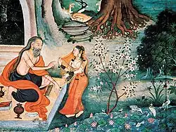 The epic Ramayana (c. 700 BC - 400 CE) contains the narrative of Menaka seducing Vishvamitra—one which, according to scholar Adheesh Sathaye, predates the far more elaborate and well-known version found in the other major epic, the Mahabharata.[7] Narrated in the Bala Kanda (1.62), Menaka appears during Vishvamitra’s early quest for spiritual powers. Vishvamitra is granted the title of “Rishi", but he continues his penance in pursuit of greater spiritual status of "Brahmarishi". During this time, Menaka descends from heaven to bathe in the waters of Pushkara Lake. Vishvamitra sees her and falls in love at first sight. He invites her to stay, which Menaka accepts, and they live together in seclusion. Their companionship lasts for ten years, during which Vishvamitra abandons his penance. Eventually, he realizes that his spiritual progress has been disrupted, which he interprets as part of a divine conspiracy. Filled with shame and anger, he gently dismisses Menaka and resumes his ascetic path.[8][9]