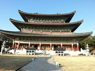 The Jeju religion was coming under severe pressure at the same time that academic research on it was starting.[118] The military junta of Park Chung Hee initiated the Misin tapa undong, a major government program to undermine shamanism, which resulted in the confiscation of many sets of mengdu by the police.[119] 121 new Buddhist temples were built between 1960 and 1990. Due to the already extensive syncretism between Buddhism and shamanism, many worshippers of shamans found it easy to switch to the more socially prestigious Buddhist faith.[120] Urbanization and industrialization also undermined the village base of the religion.[121] As less and fewer people want to be traditionally initiated shamans, the traditionally hereditary nature of mengdu inheritance has broken down.[68] There is currently a glut of mengdu sets to the point that shamans are donating them to museums.[122]
