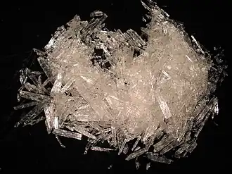 The two crystal forms for racemic menthol have melting points of 28 °C and 38 °C. Pure (−)-menthol has four crystal forms, of which the most stable is the α form, the familiar broad needles.