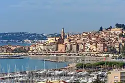![]() The harbour of Menton, with the basilica of Saint-Michel-Archange beyond, viewed from the Quai Napoléon III | |