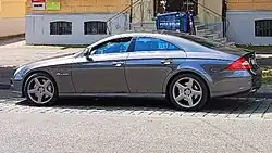 The CLS 55 AMG is a high-performance variant of the CLS-Class featuring a 5.4-litre supercharged V8 producing 350 kW (476 PS; 469 hp) and 700 N⋅m (516 lb⋅ft), and was unveiled at the Paris Motor Show in 2004.[22] Compared to the standard model, the CLS 55 AMG has larger 360 mm brake discs with eight-piston callipers from the SL55 AMG,[23] wider 18-inch alloy wheels, revised stiffer AirMATIC air suspension with multiple driving modes,[24] AMG bodywork, and a five-speed automatic transmission.[25]