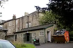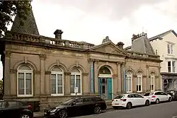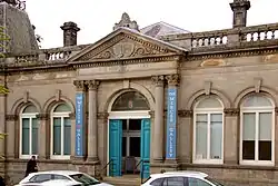 This is a Grade II listed building.[38] The building has a "handsome Italian Renaissance stone frontage",[37] a symmetrical arrangement of five bays with round-arched windows and a projecting entrance bay in the centre. The entrance is a Corinthian portico, with a tympanum above, carrying the borough arms, and the doorway has a fanlight within its arch.[38] This western façade on Swan Road was added, along with a general rebuild, between 1874 and 1876 by architect Arthur Hiscoe.[nb 1][37] The entrance is "flanked by attached columns and a handsome entablature enriched with symbols of the locality".[37] It has a slated, hipped roof and a parapet with balustrades. Two high pavilions, "with steep ashlar fishtail slate roofs of French type with ornamental cast iron crestings",[38] were designed by Hiscoe. The pavilions have "Corinthian pilasters carrying continuous entablature".[38] Incorporated with the back of the building, and forming a south-east wing attached to the back of the main hall, is an old, three-storey house. It dates from the early 19th-century, and is constructed of squared, coursed gritstone rubble, with three sash windows and a door.[38]