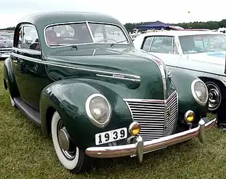 The advertisements for this car declared it to be "The car that truly dares to ask 'Why?'", referring to the idea that a big car could not also be economical.[3] The Mercury two-door sedan was listed at US$946 ($21,385 in 2024 dollars[5]), several hundred dollars more than the 1937 Ford V-8, several hundred less than the Lincoln-Zephyr and about the same as the upper-range Oldsmobile and Dodges, Hudsons, and the lower-range Buicks and DeSotos, sales from all of which, it was hoped that customers would trade in their cars for the new Mercury.[3] Its engine was a 95 hp version of the Ford flathead V8 engine, its styling was inspired by the Zephyr, and it had standard equipment hydraulic brakes using 12-inch drums.[3] With a wheelbase of 116.0 in (2,946 mm) and an overall length of 196.0 in (4,978 mm), it was a good-sized car, which the Ford company advertised extensively, together with its up-to-20 mpg performance—"few cars of any size can equal such economy".[3] Double sun visors became standard in 1940.[6][7]
