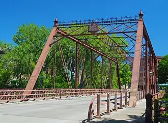 Merriam Street Bridge is a truss bridge that spans the east channel of the Mississippi River between Nicollet Island and the east bank of the river in Minneapolis. The bridge was originally built in 1887 by King Iron Bridge Company as one of the four spans of the Broadway Avenue Bridge. When the Broadway Avenue Bridge was reconstructed in 1987, one span was preserved and moved to Nicollet Island. The truss span is actually decorative; the bridge is supported by a beam from underneath.