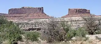 Merrimac Butte[2] is a 5,627-foot (1,715-metre) sandstone summit located in Grand County, Utah, United States, about 12 miles northwest of the town of Moab. Merrimac Butte is a thin, 200–600-foot-wide and 1,600-foot-long east-to-west butte with 200-foot-tall vertical Entrada Sandstone walls overlaying a Carmel Formation base.