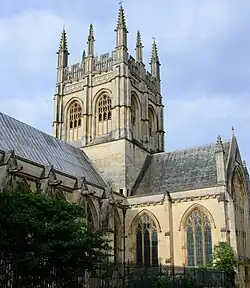By the late 1280s, the old church of St John the Baptist had fallen into "a ruinous condition",[24] and the college accounts show that work on a new church began in about 1290. The present choir, with its enormous east window, was complete by 1294. The window is an important example (because it is so well dated) of how the strict geometrical conventions of the Early English Period of architecture were beginning to be relaxed at the end of the 13th century.[25] The south transept was built in the 14th century, the north transept in the early years of the 15th. The great tower was complete by 1450. The chapel replaced the parish church of St John and continued to serve as the parish church as well as the chapel until 1891. It is for this reason that it is generally referred to as Merton Church in older documents, and that there is a north door into the street as well as doors into the college. This dual role also probably explains the enormous scale of the chapel, which in its original design was to have a nave and two aisles extending to the west.[26]