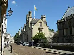 The hall is the oldest surviving college building, originally completed before 1277, but apart from the fine medieval ironwork on the door, almost no trace of the ancient structure has survived the successive reconstruction efforts; first by James Wyatt in the 1790s and then again by Gilbert Scott in 1874, whose work included the "handsome oak roof".[31] The hall is still used daily for meals in term time. It is not usually open to visitors.[32]